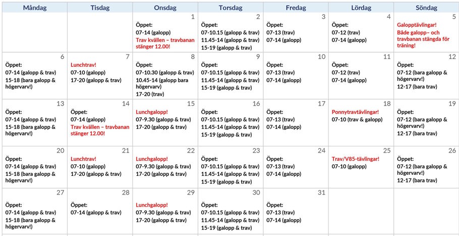 Aktuella träningstider finner ni nedan. Tävlingsbanan stängs alltid för preparering kl 12 när det är kvällstrav. När det gäller provlopp torsdagar är galoppens bana stängd 10.15-11.45 med anledning av värmning och provlopp för travarna. OBS! Nytt schema för varje månad! Vi ber er också att fortsätta visa hänsyn och respekt för varandra, ännu viktigare nu när vi gör dessa förändringar.